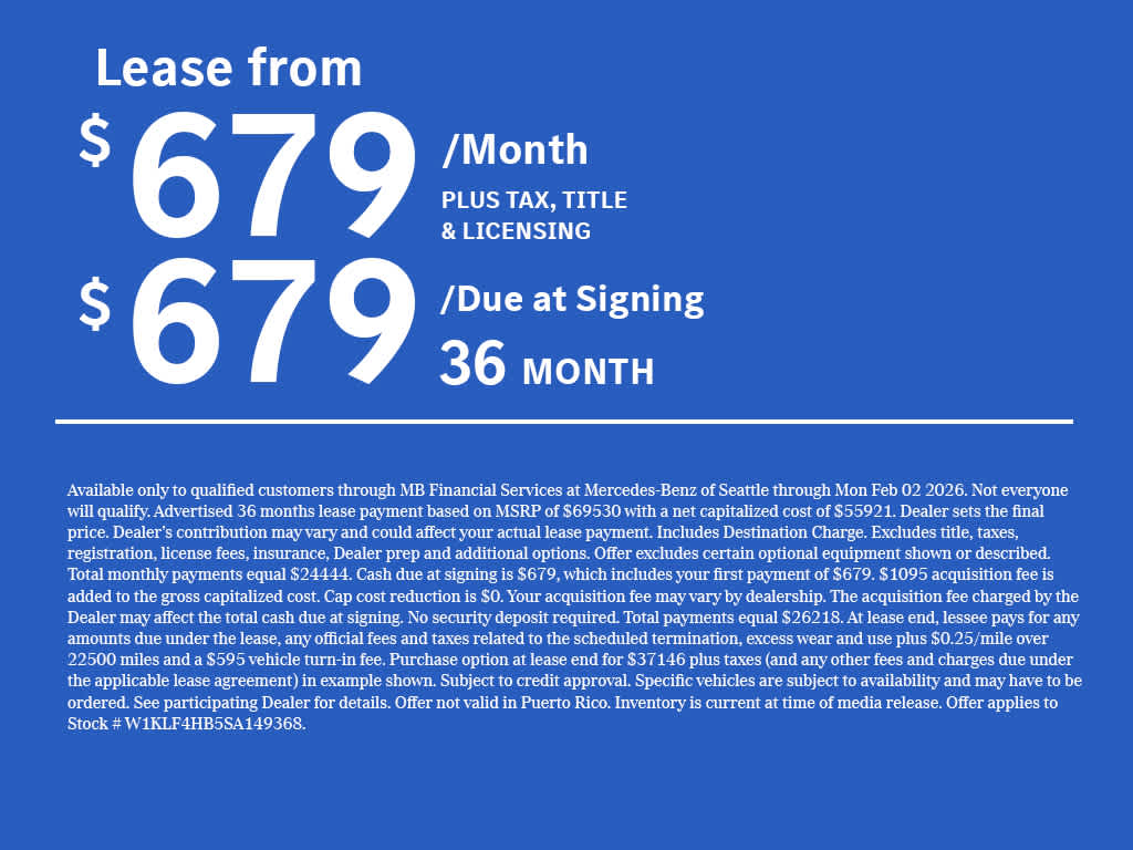 WHEELS: 19 AMG® 5-TWIN-SPOKE LIGHT-ALLOY W/BLACK: 19 x 8.5J front and 19 x 9.5J rear, Tires: 245/45R19 Fr & 275/40R19 Rr, Burmester® 4D SURROUND SOUND: 730 watts, 17 premium speakers w/speaker units in headliner, 4 additional sound generators (2 each in the backrests of the front seats), 15 amplifier channels, 3 sound profiles (Pure, 3D-Sound and Individual), Dolby Atmos w/2 3D speakers in front roof liner, Dolby Atmos technology for compatible audio formats, playback via the music streaming services Amazon Music and Apple Music integrated in the vehicle (user account required) or via your own external data carrier (connection to MBUX multimedia system required), Sound Personalisation, sound reproduction tailored to individual musical taste, VENTILATED FRONT SEATS, WINTER PACKAGE: Heated Steering Wheel, Winter Package Factory Code, Heated Windscreen Washer System, BODY COLOR REAR SPOILER, Navigation, Full-Time 4MATIC® All-Wheel, Power Liftgate, Back-Up Camera, Satellite Radio SPC Exchange Privilege for 7 days or 500 miles, whichever comes first, Each Certified vehicle must pass a rigorous inspection of over 165 points, 24-Hour Roadside Assistance includes trip routing, trip interruption coverage and technical help, A network of over 300 Mercedes-Benz dealers will support your Certified Mercedes-Benz, Carfax Vehicle History Report, Balance of New Car Warranty plus 1 year/unlimited miles extended Limited Warranty Welcome to Mercedes-Benz of Seattle, your local, family-owned Mercedes-Benz dealer near Bellevue, WA. We are proud to be part of the Seattle community and have called it home since 1957. At Mercedes-Benz of Seattle we are always looking for ways to give back and sponsor local schools and the rodeo. But we dont just serve Seattle. In fact, our customers visit us from Tacoma, Edmonds, Lynnwood, Kirkland and even Redmond, WA.